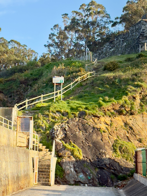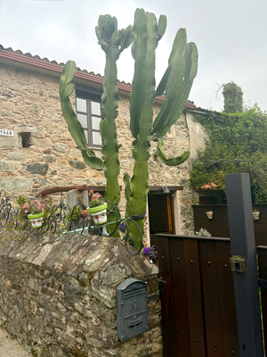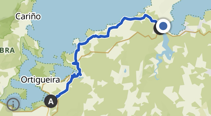 gegen acht hab ich das hotel verlassen. gleicht daneben rechts war eine bar. hier waren ältere, einheimische herren als gäste. da habe ich nur kurzen blick rein geworfen und gesehen, dass es alles nur abgepackte sachen gab. nach hygienevorschriften müsste der laden sofort schließen. in einer bar im ort habe ich tortilla und kaffee bekommen. auf dem weg dorthin ist mir aufgefallen, dass die grünflächen, die hier in der stadt verteilt sind, tatsächlich gesprengt werden mittels automatischer bewässerungsanlage. um 8:30 uhr habe ich mich auf den weg gemacht. zum ende des hafens ging nach rechts schon mal gleich 50 stufen nach oben. die dortige festungsanlage konnte leider nicht besichtigt werden, da sie verschlossen war. danach ging es schön bergauf mit steilen passagen, so dass die stöcke gleich zum einsatz kamen. das meer liegt jetzt die ganze zeit linksseitig von mir.von circa kilometer sieben an ging es ständig und stetig richtig steil hinauf.steigung bis zu 10%, sorgten schon mal für eine kurze verschnaufpause . nach ca. 12 km war auf der linken seite der leuchtturm zu sehen, der einige hundert meter nach unten entfernt stand. mit zwanzigfache vergrößerung war das teil gut sichtbar, was auf dem foto zu sehen ist. das wird hier heute wohl die königsee etappe sein, denn ein ende dessen, dass es hier rauf und runter geht nicht ist nicht abzusehen. bevor ein neuer, kräftiger anstieg über einen berg gehen sollte, ging nach rechts ein weg in den wald ab. laut karte sollte das ein weg sein. war es auch, aber nicht lange, dann muss man sich tatsächlich durch den wald kämpfen, also die schlechteste aller ideen, der ich nachgegangen bin. nach einer gefühlten halben stunde kam ich zu einem eukalyptuswald, wo es möglich war, nach rechts runter zu gehen. nach 100 m führte der weg zu einer straße. hier stand ein schild mit namen o villar. es sind hier ein paar häuser. da die sonne kräftig schien, suchte ich mir einen ort, um schatten zu finden. dieser entpuppte sich als häuschen dass sowohl als schattenspender als auch gleichzeitig wasserversorger diente, da hier für personen trinkbares wasser in ein becken lief. ich machte mir meine blutigen kniee von bromberrsträuchern u anderen stacheligen ästen sauber u cremte mich noch mal ein. danach stärkte ich mich mit einer banane und einem müsliriegel. danach ging es wieder auf den weg. da sich im handy die route noch nicht eingerichtet hatte, fragte ich eine farbige frau, die dort wohnte, nach dem richtigen weg. wir sprachen auf ihren wunsch in englisch. sie sagte mir, dass sie mich zu der stelle bringe würde, wo ich den weg auf der straße nach carino gehen könnte. bis dahin hatte ich schon ca 15 km geschafft. bis 25 km sollten es werden. gesagt getan. wir fuhren los. doch statt des abgesprochenen weges fuhr sie mich binnen 20 min zurück nach cedeira bis zur post. von dort fährt der mon-bus nach carino. auf meine nachfrage warum sie entgegen der absprache so gefahren sei, gab es als antwort, dass es doch einfacher sei so nach carino zu kommen. ich bedankte mich u wollte den weg bezahlen. wie weigerte sich geld für die fahrt anzunehmen. auf nachfrage bei der post wurde mir gesagt, dass der bus um 17.15 nach carino fährt. in der gegenüber liegenden bar habe ich was getrunken u anschließend bei gadis bananen, erdbeeren u sonnencreme gekauft. die erdbeeren habe ich gleich an einem überdachten stand in der nähe gegessen. geschmacklich waren sie gut. in 40 min war der bus in carino. die unterkunft liegt an der hauptstraße. es wird von einem alten ehepaar betrieben. entsprechend länger dauerte es mit anmeldung u bezahlung. am abend aß ich unten im restaurant einen meeresfrüchtesalat. zur bezahlung mit karte rief sie ihren mann, der den vorgang erledigte. morgige tour carino-ortiqueira, ca 21 km.
