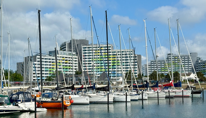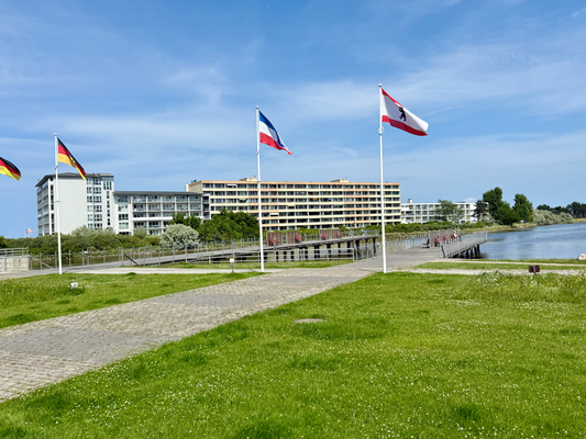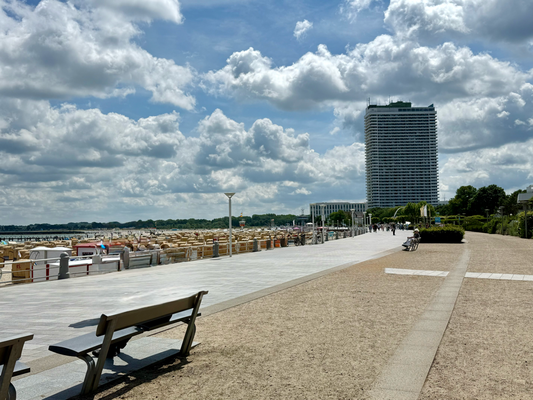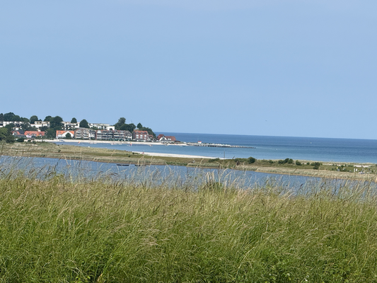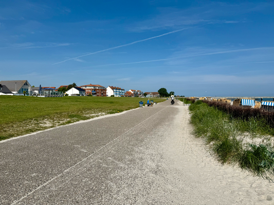 über straßen und schotterwege führten die wege nah an der ostsee vorbei. der wegverlauf war überwiegend flach. erst ist im bereich ostholstein waren einige steigungen dabei. auf den letzten kilometern nach heiligenhafen wurde der wind kräftiger und es war natürlich gegenwind. ähnlich wie in damp sind auch hier in heiligenhafen diverse gebäudekomplexe als ferienquartiere hochgezogen worden.
