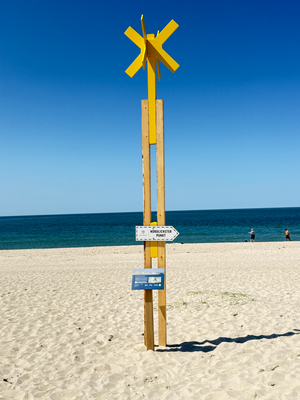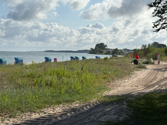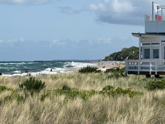 wir starteten bei sonnigem wetter. jedoch hatten wir heute gleich 5-6 windstärke konstant gegen an. der streckenverlauf war dem von gestern ähnlich. es war wieder sehr wellig mit kurzen, knackigen steigungen. auf der ostsee waren weiße schaumkronen zu sehen und und und circa 2 m hohe wellen. die roten flaggen für das badeverbot waren gehisst. windsurfer und kiter hatten ihren spass mit der welle.