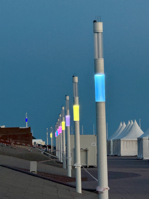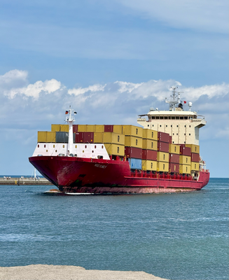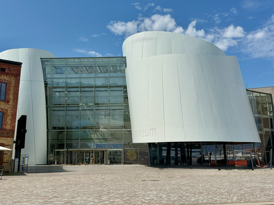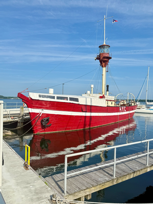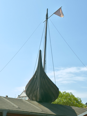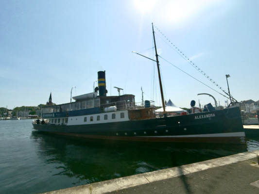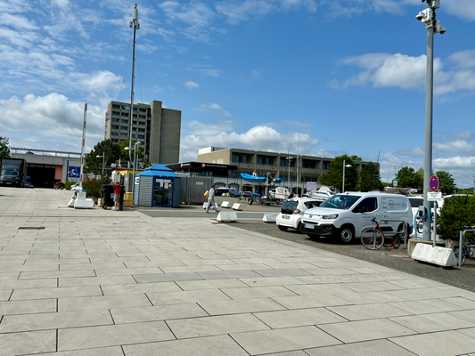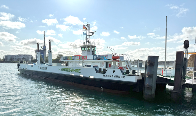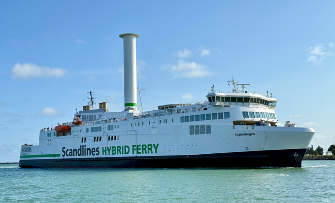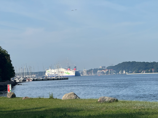 zu der zeit fuhr ein großes schiff, die scandlines hybrid ferry in die stadt ein. was auf dem schiff aussieht wie ein schornstein ist ein rotorsegel. dieser erzeugt durch den wind energie, die in batterien gespeichert u bei bedarf abgerufen wird.