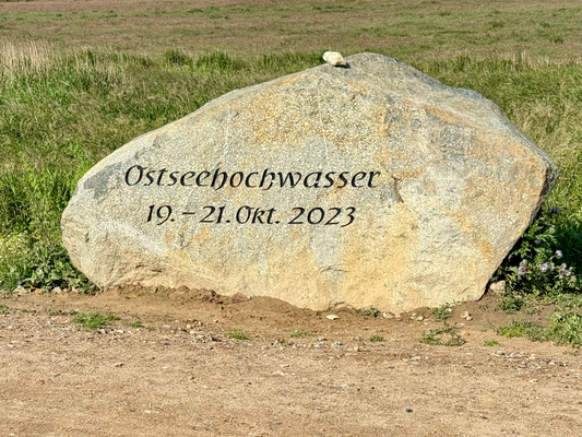 kurz hinter damp befindet sich auf dem radweg ein feldstein mit hinweis auf das hochwasser vom oktober 2023.