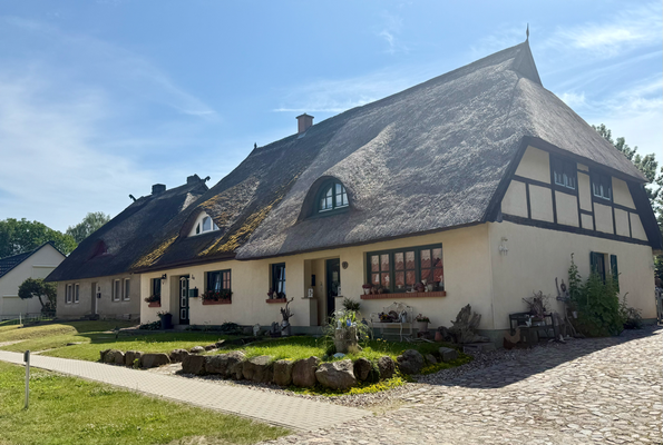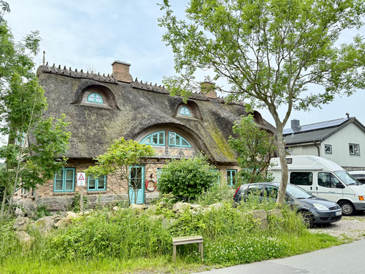 schon war der beginn der halbinsel darß erreicht. zunächst ging auf einem damm weiter. später folgten auch kleine orte in denen wieder nur reetdachhäuser standen.