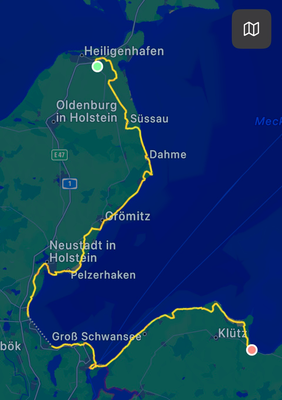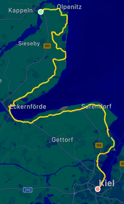 denn von flensburg über glücksburg bis zur geltinger bucht ging es bis ca 40 km ständig an den straßen u wegen kräftig rauf u runter mit steigungen bis zu 9%.