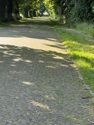 nach ca 2,5 km wechselte der straßenbelag von geteert in kopfsteinpflaster unterschiedlicher größe. das ging über 15 km, so dass wir, als auch unsere räder kräftig durchgeschüttelt wurden.