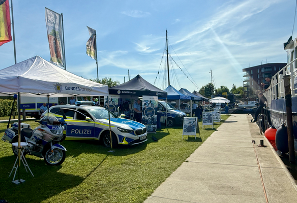 am hafen war eine große ansammlung vom booten. unter anderem auch von der bundespolizei und der wasserschutzpolizei. darüber hinaus standen diverse streifenwagen davor auf dem geländeabschnitt. wir suchten die kollegen auf. hier wurde uns mitgeteilt, dass heute mecklenburg-vorpommern tag ist und behörden und organisationen sich über die stadt verteilen und sich mit ihrem ständen präsentieren.