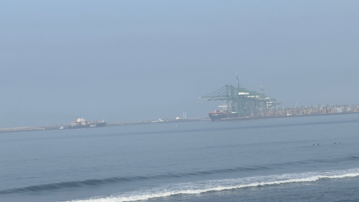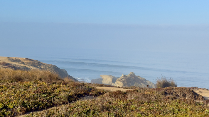 gegen 8:45 uhr verließ ich das haus und fand in nur fünf minuten den weg zur küste. das meer lag zu meiner linken seite, und die atmosphäre war ein wenig diesig, sodass nur einige große frachter verschwommen zu sehen waren.