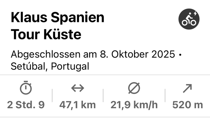 danach suchte ich mir ein neues quartier und fand es 1,5 km weiter. am abend aß ich noch etwas obst und studentenfutter und stellte fest, dass es bis lissabon morgen noch etwa 40 km sein sollten. in der stadt werde ich mir ein oder zwei tage zeit nehmen, um die sehenswürdigkeiten in ruhe zu besichtigen.