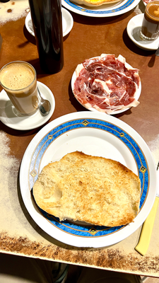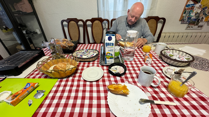 Gegen 07:30 Uhr verließen wir unser Quartier, um in der nächstgelegenen Bar zu frühstücken. Auf dem Weg dorthin hat es kräftig geregnet. In der Bar aßen wir ein Baguette mit Schinken und Tomatenmuss.