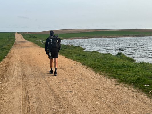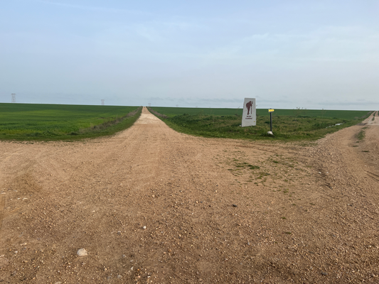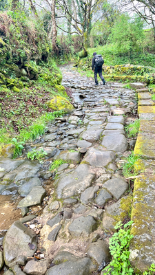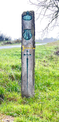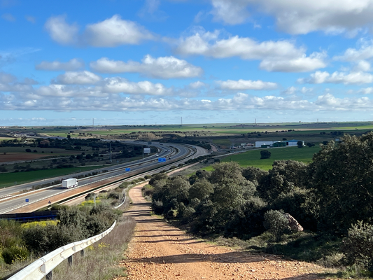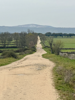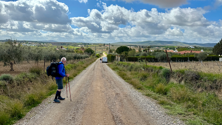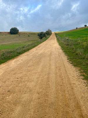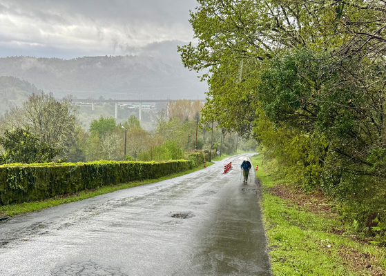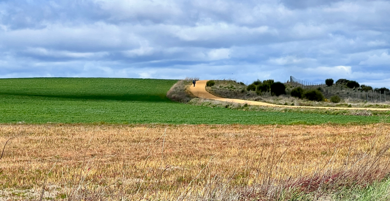 befestigter Pilgerweg angelegt worden. Wir blieben zunächst auf der Straße, ehe wir bei ca. km 10 auf den Pilgerweg wechselten. Da dieser aber ständig kräftig wellig verlief, wechselte ich schnell
