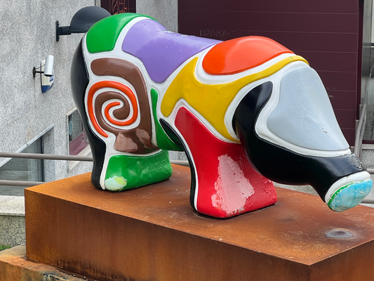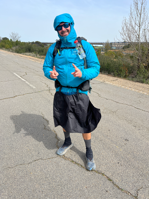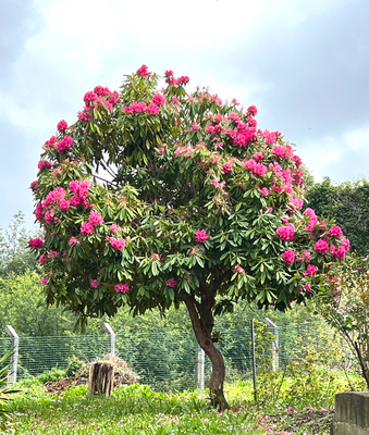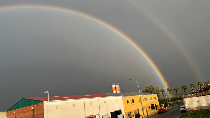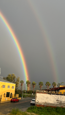 Der rosafarbene Umhang wiegt mehrere Kilogramm. Nach einem Einkauf im Ort hagelte u schneite es kurzfristig kräftig. Danach schien wieder die Sonne. Daher gab es auch 2 Regenbogen. Den Abend haben