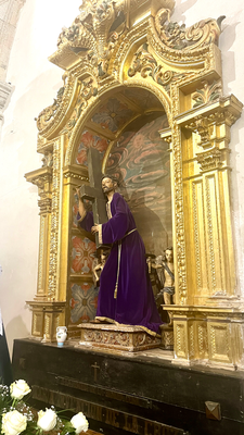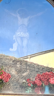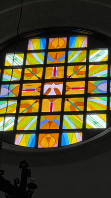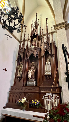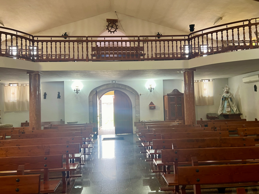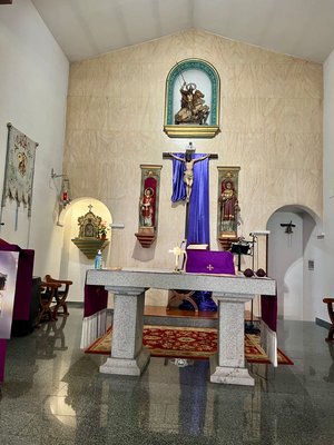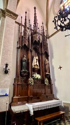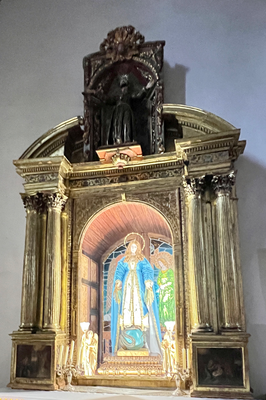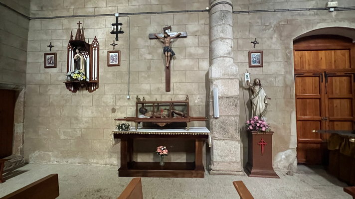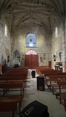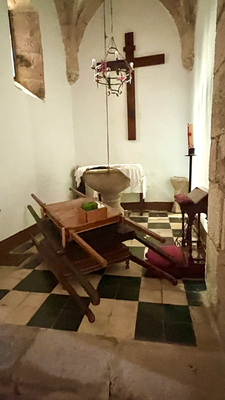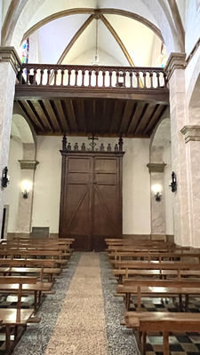 Sie soll abends ab 19 h geöffnet sein. Bisher habe ich sie noch nicht geöffnet vorgefunden. Man kommt in den Vorraum der Kirche, in der eine weitere Holztür als Eingang ist. Im