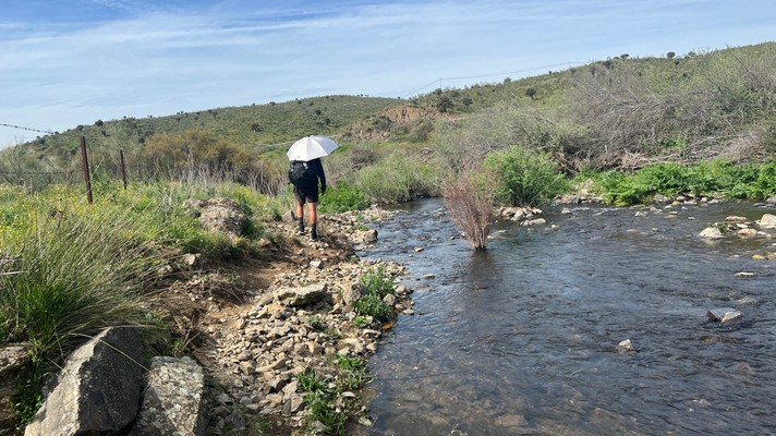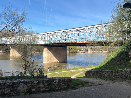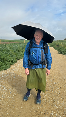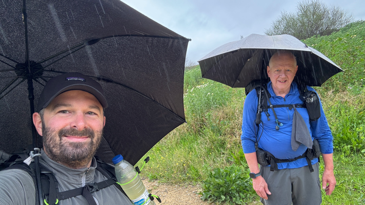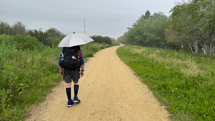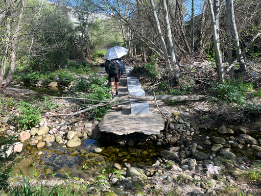 Flussentlang. Nachdem wir eine Brücke beim Fluss passiert hatten, fing es an zu regnen u wir nutzten unsere Regenschirme. Auf dem Weg trafen wir auf Jörg aus Dresden, der die Etappe mit uns zu Ende