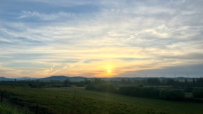 Gegen 0800 h gab es ein kleines Frühstück u Kaffee im Hostal. Um 0815 h machten wir uns aus den Weg der heutigen Etappe. Es war sonnig bei 5°. Neben einem Industriebereich startete der