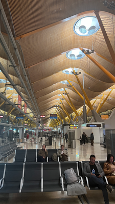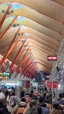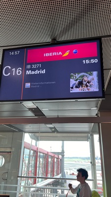 Mit dem Kielius Bus gings zum Hamburger Flughafen von wo der Flieger von Iberia um 15.50 h startete und gegen 19.00 h in Madrid landete. Hier war eine riesige Halle von deren Gates diverse Fliegervon