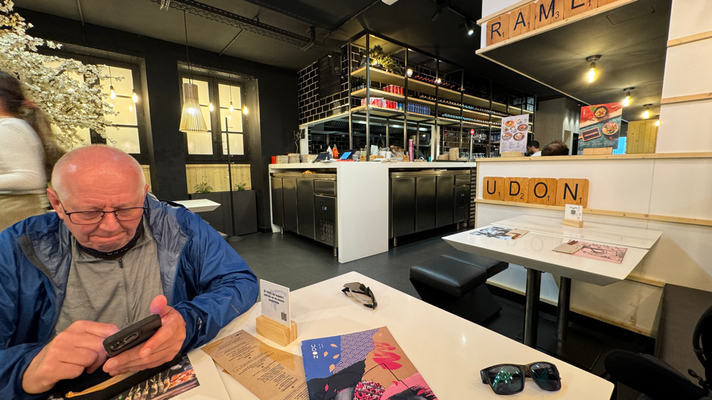 zahlreiche Personen auf dem Boden. Leider verdeckten Wolken die Sonne. Nach einigen Fotos gingen wir auf Tipp von Marcel zum asiatischen Restaurant Udon und aßen dort ein leckeres 3-Gänge Menu