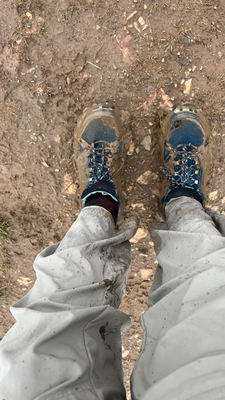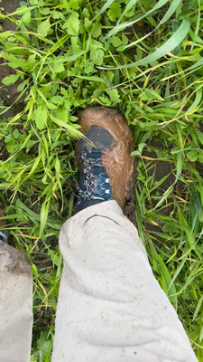 Schuhen darin versank oder eine Menge Erde an den Schuhen hängen blieb. So war das Vorankommen schon mühsam und war wie im Schneckentempo.